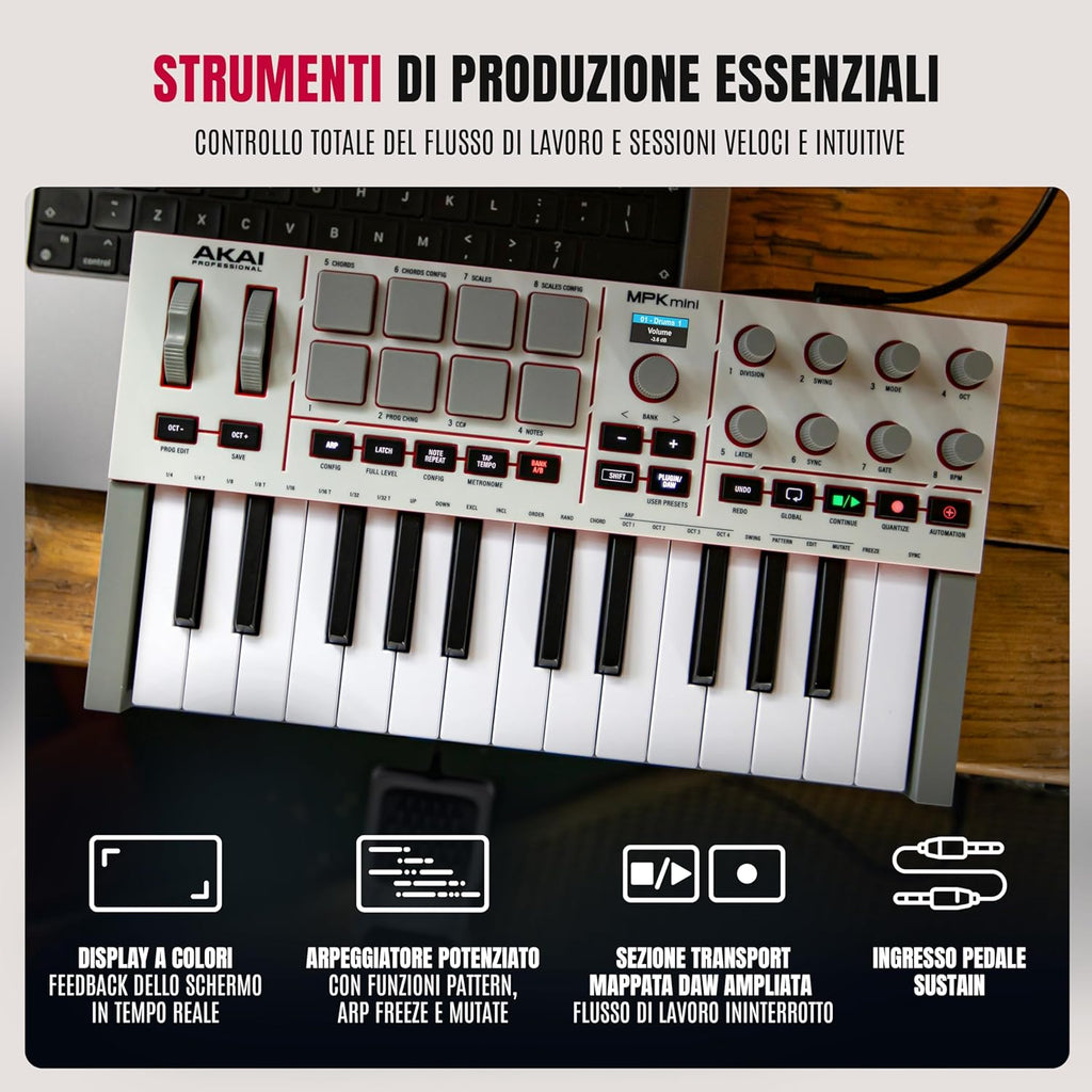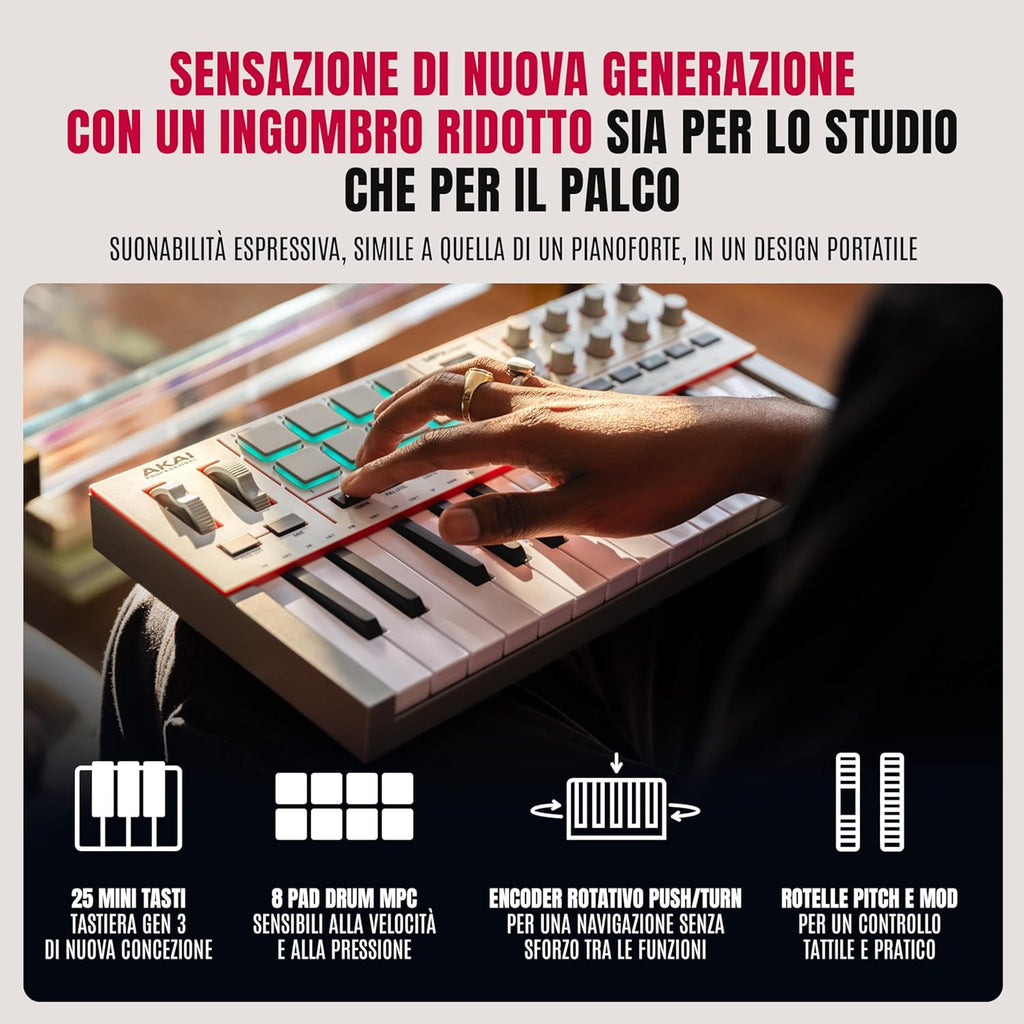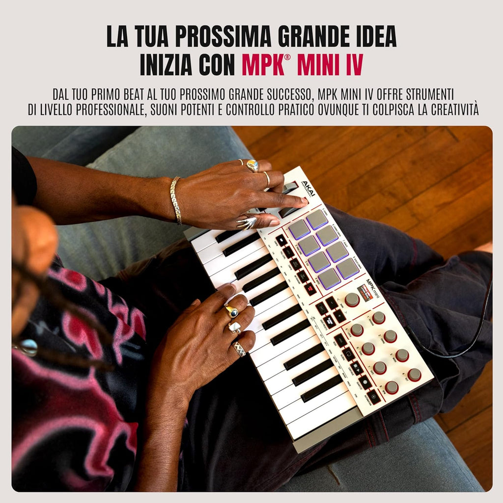 Akai Professional MPK Mini IV è il controller MIDI compatto e versatile pensato per musicisti, beatmaker e producer moderni. Offre una tastiera mini a 25 tasti con keybed "best-in-class" di nuova generazione, 8 pad MPC retroilluminati RGB sensibili a velocity e pressione, wheel dedicate per Pitch e Modulation, 8 encoder a 360° e uno display a colori per un controllo immediato e completo. La connettività USB-C e l'uscita MIDI Out DIN 5 poli garantiscono massima flessibilità, mentre la nuova Studio Instrument Collection con oltre 1.000 preset professionali programmati da AIR Music Tech, Akai Pro e Moog amplia le possibilità creative fin dal primo utilizzo.