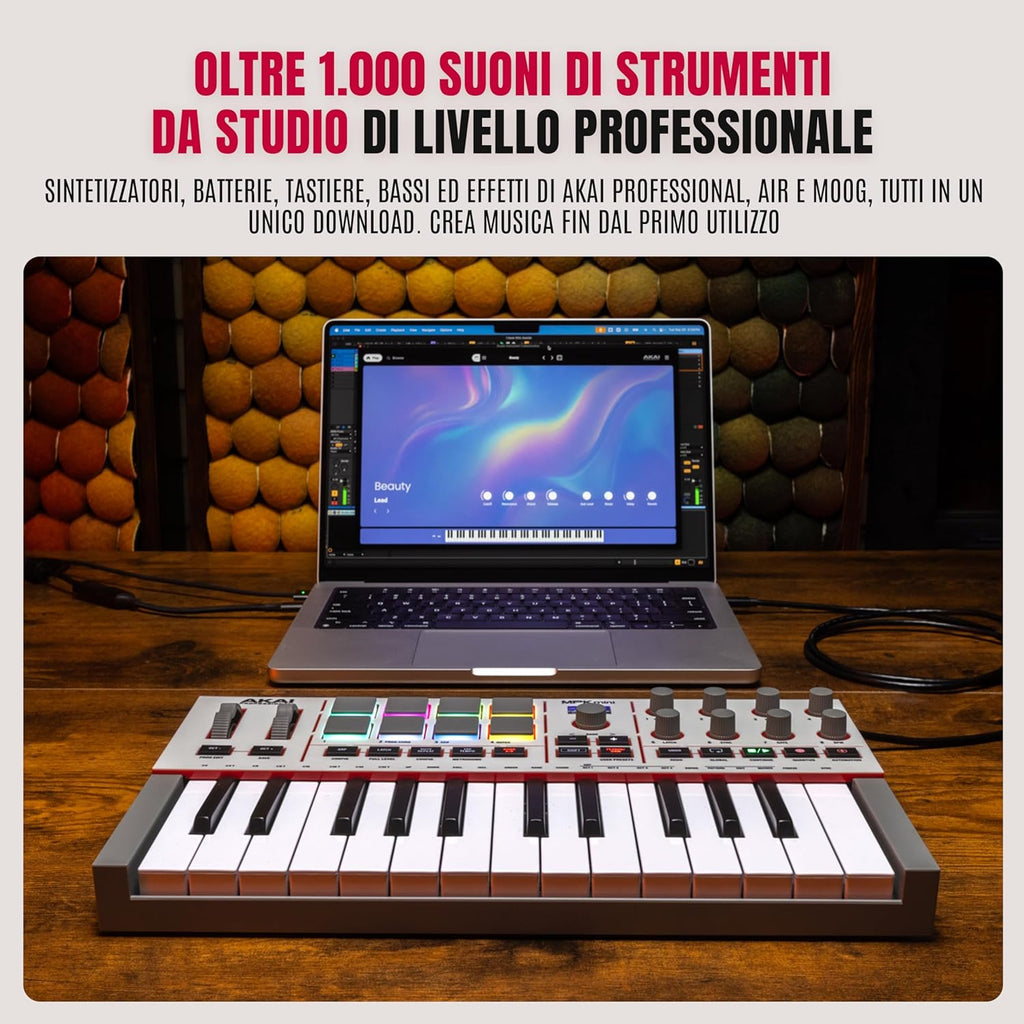 Incluso nella confezione, il nuovo Studio Instrument Collection, un virtual instrument sviluppato da Akai, AIR e Moog con oltre 1.000 preset professionali. Il controller è pre-mappato 1-to-1: basta ruotare i knob e premere i pad per navigare tra i suoni e regolare parametri senza dover ricorrere al mouse. Completano la dotazione Ableton Live Lite 12, più trial di Melodics e Splice, per iniziare subito a produrre musica.