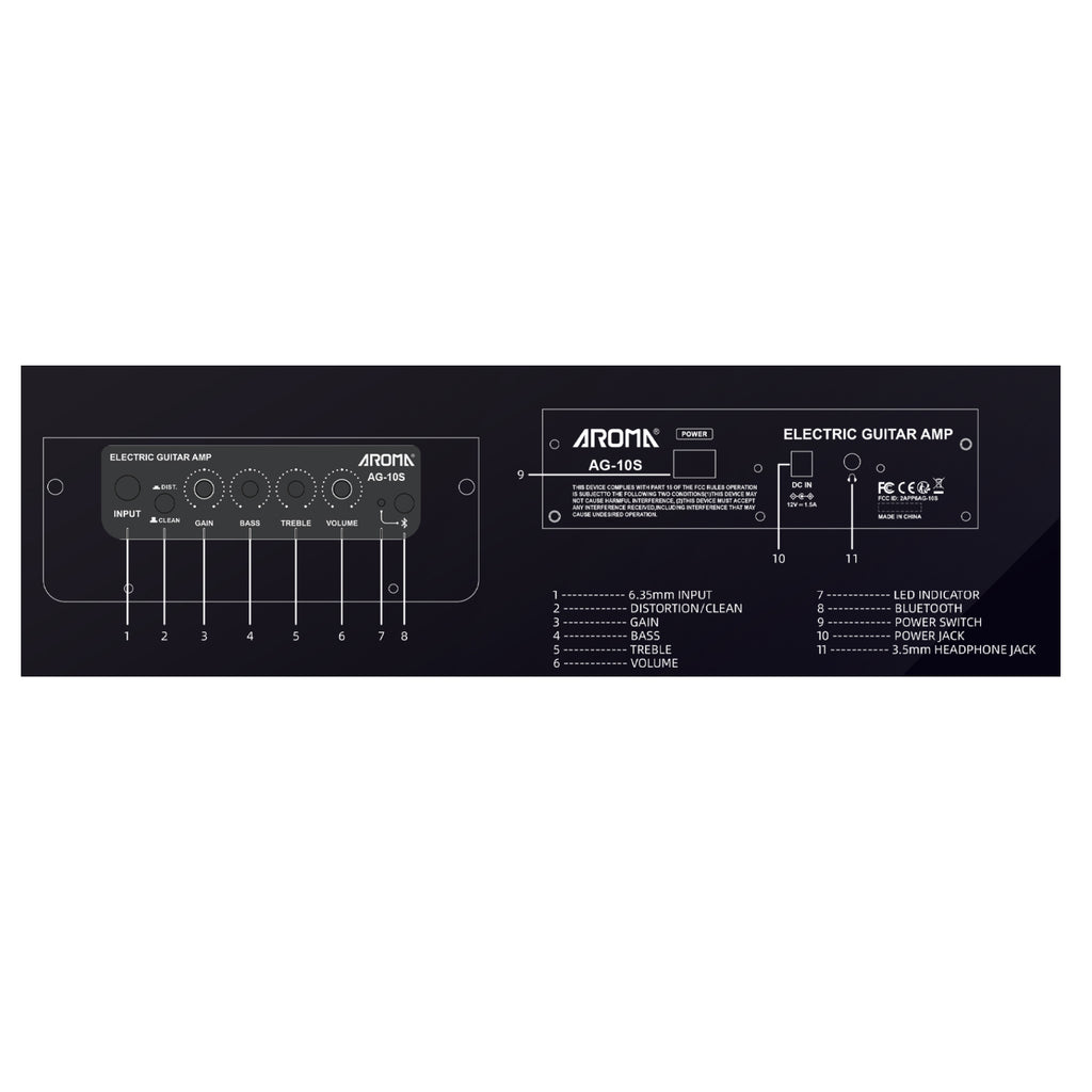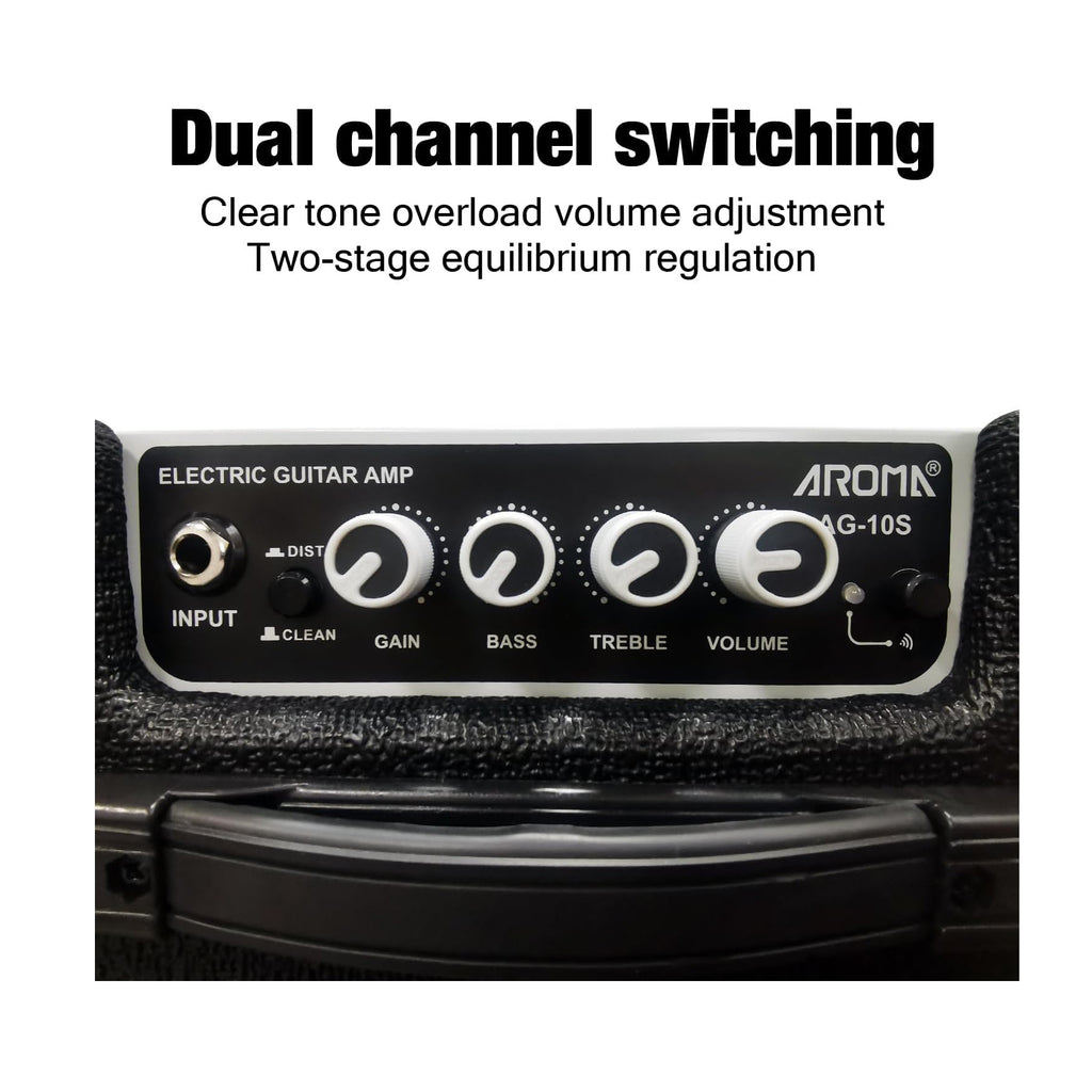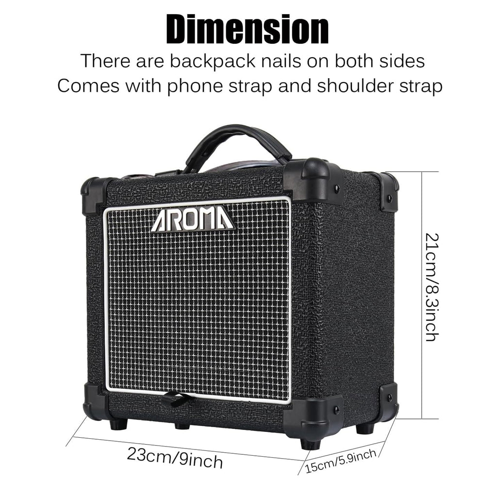 L'amplificatore Aroma AG10S suona bene anche a basso volume. La chitarra ha un suono eccellente che può ispirare molti musicisti. Pertanto, non dovresti trascurare di aggiornare l'amplificatore, anche se lo usi solo per l'allenamento a casa. Qualità del suono. Il sistema audio utilizza un core con tecnologia di Classe D con una potenza di 10 W, quindi l'Aroma AG-10 offre un suono abbastanza realistico, puoi usarlo comodamente in uno spazio di 30 metri quadrati o portarlo con te in viaggio. Dimensioni compatte, aspetto elegante. Con un peso ultraleggero di circa 2 kg e dimensioni di 239 mm x 179 mm x 224 mm (Lunghezza x Larghezza x Altezza), oltre a un design moderno e dinamico, l'AG-10S sarà sicuramente un compagno indispensabile, in grado di seguirti ovunque. Miglioramenti e aggiornamenti alla funzionalità Bluetooth. Connettività Bluetooth integrata. Riprodurre musica in parallelo con una chitarra elettrica rende l'esperienza migliore che mai con un amplificatore compatto e super "economico". Parametri dettagliati: Amplificatore Aroma AG-10S. Potenza: 10 W, altoparlante da 5 pollici, alimentazione diretta DC-12 V, jack: chitarra, AUX, connessione Bluetooth.