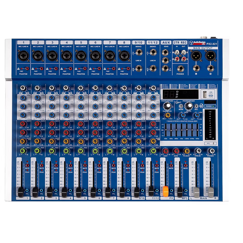 Audiodesign PX2.821 Mixer Pro 12C -8Mono 2Stereo 2Aux USB/BT e DSP a 24 Effetti