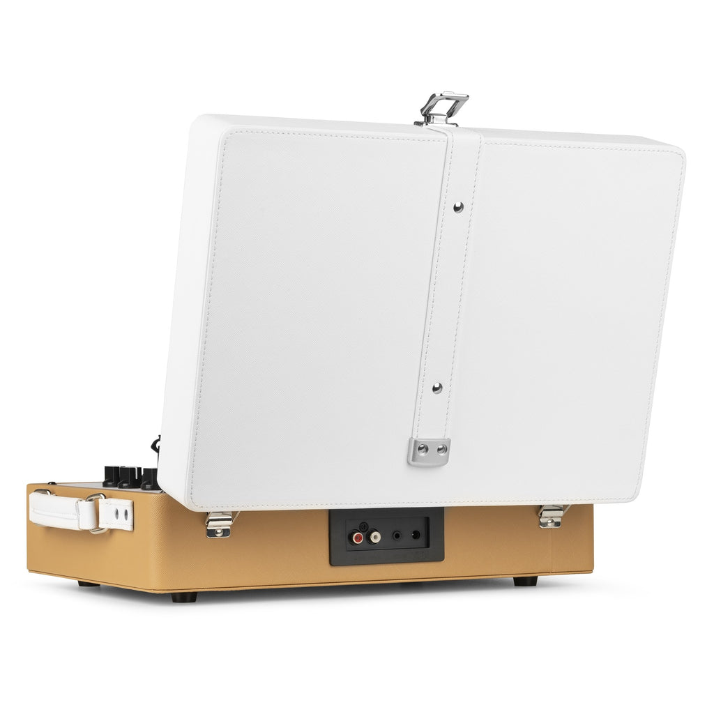 Giradischi a valigetta con altoparlanti color oro da 10w rms, modalità wireless-bluetooth che consente di riprodurre musica digitale in streaming wireless da smartphone, tablet o altri dispositivi compatibili.