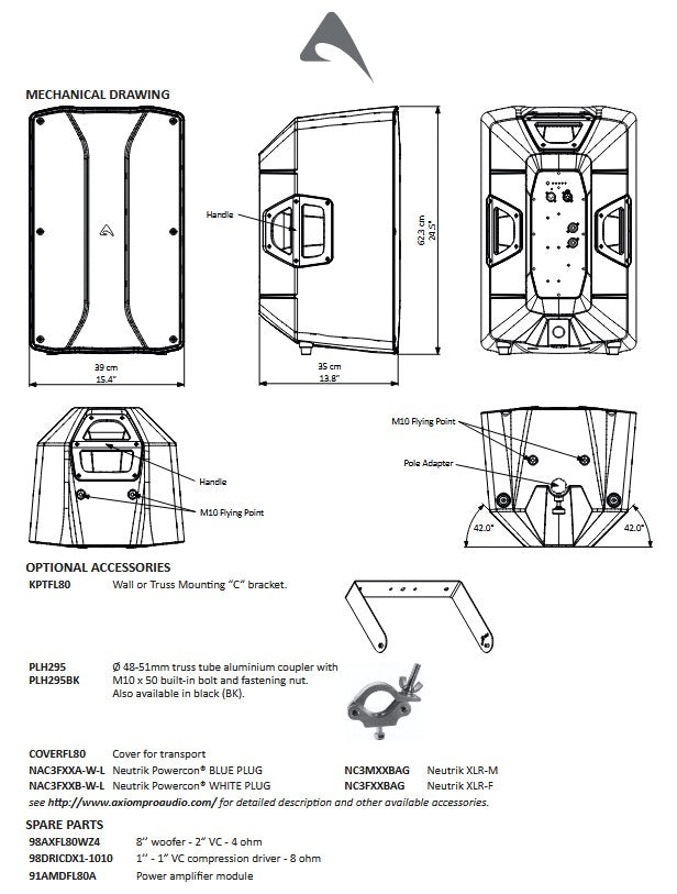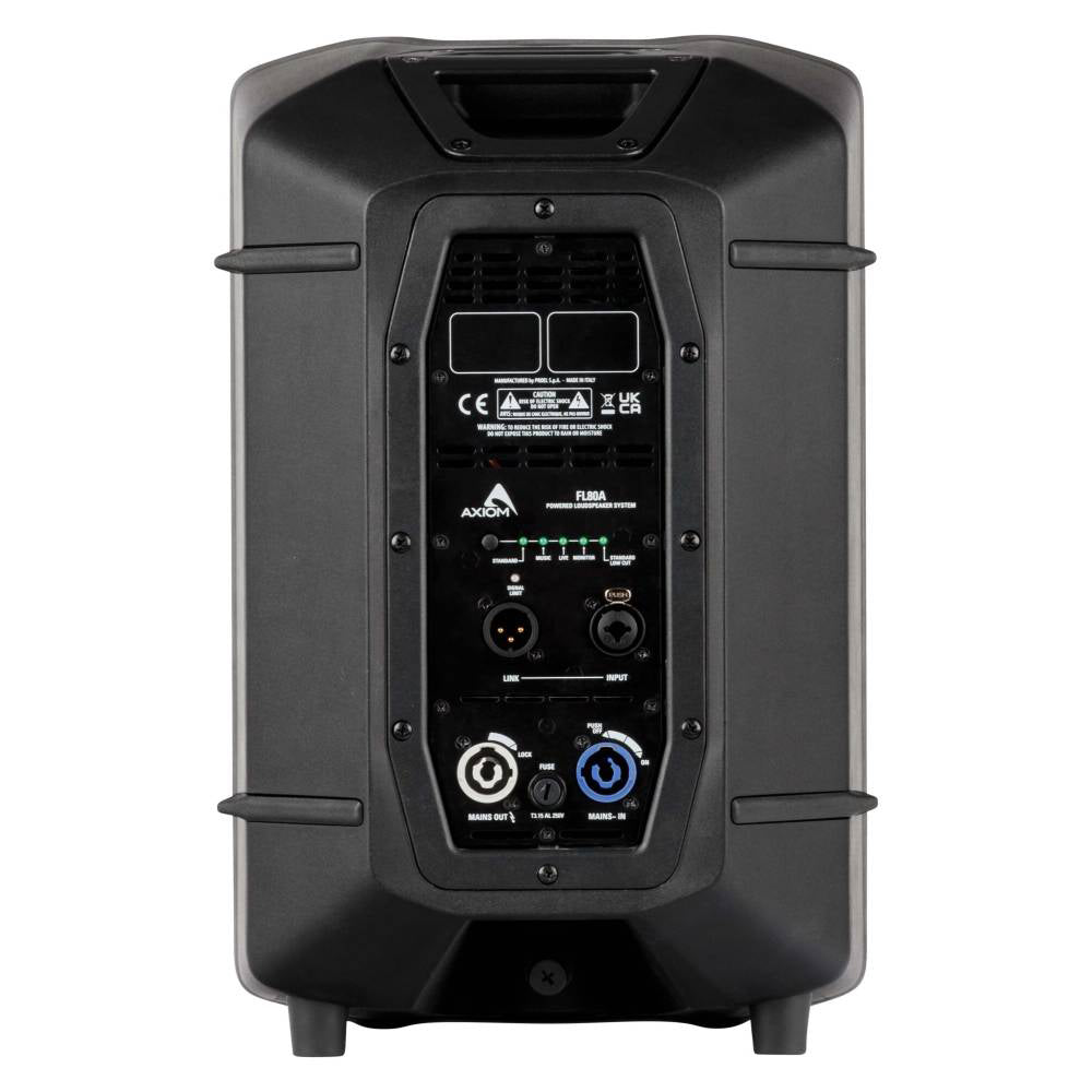 FL80A è un diffusore acustico attivo a due vie con sorgente puntiforme che offre una risposta in frequenza completa e una dispersione controllata in un cabinet facilmente gestibile. È progettato per molteplici applicazioni di amplificazione sonora in primo piano che richiedono un suono di alta qualità, prestazioni ripetibili e praticità d'uso in un formato facilmente trasportabile. Il driver al neodimio per le basse frequenze da 8" è abbinato a un driver a compressione per le alte frequenze da 1" con bobina mobile in alluminio da 1", per un peso ridotto e una buona risposta ai transienti; ciascuno di essi è pilotato da singoli canali di un potente modulo amplificatore in Classe D. La tromba per le alte frequenze, progettata su misura, offre una copertura ampia e precisa per un tipico auditorium. Il cabinet ventilato simmetrico dell'FL80A gli consente di adattarsi a molteplici applicazioni portatili e fisse, come ad esempio in applicazioni front-of-house su un supporto per diffusori, o montato su un palo con un subwoofer associato o, utilizzando l'angolo di inclinazione di 42°, come potente monitor da palco. Il cabinet in PP ad alta densità, compatto e leggero, è dotato di un attacco per palo da 35 mm, tre maniglie in alluminio incassate per un facile sollevamento e movimentazione e punti di aggancio M8 per consentire la sospensione in installazioni fisse tramite staffe di montaggio opzionali. Per estendere la risposta in bassa frequenza del sistema, l'FL80A può essere completato con subwoofer della serie Axiom SW, come l'SW18A.