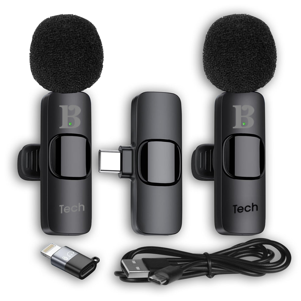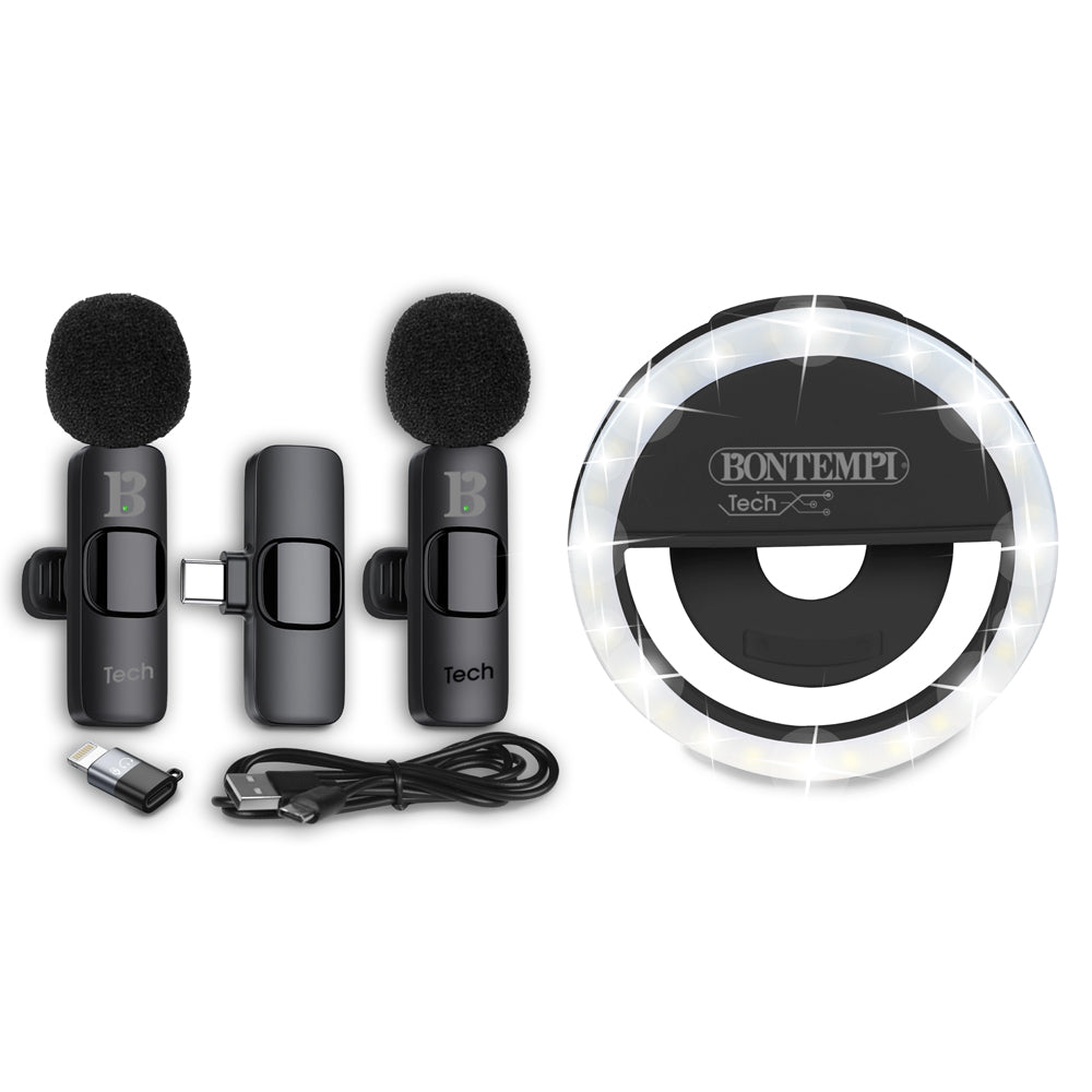 2 Microfoni wireless lavalier. Possono essere utilizzati per per smartphone, tablet e laptop/PC e altri dispositivi che utilizzano porte Type-C o Lightning. Perfetti per live streaming, registrazione video, interviste, riunioni online. Ricevitore da collegare al dispositivo. Accoppiamento automatico. Riduzione del rumore integrata. Ring light con 3 livelli di intensità luminosa. Microphoni e ring light: presa USB Tipo-C per ricaricare la batteria al litio (cavetto di carica fornito).