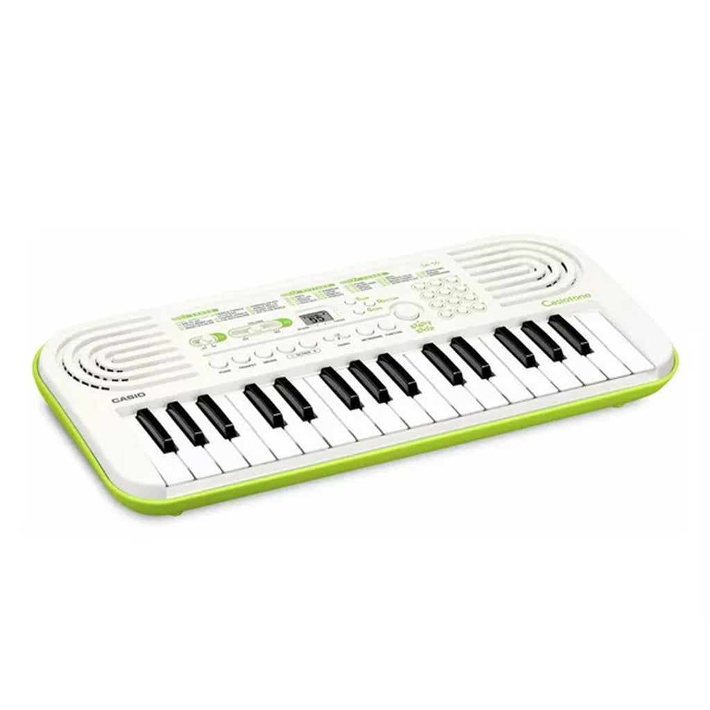 Casio SA-50 Mini Tastiera polifonica a 32 tasti, Bianco fondo in Verde Lime. Il primo approccio alla musica avviene di solito durante l'infanzia: per renderlo un momento unico ed indimenticabile, milioni di persone in tutto il mondo si affidano da sempre alle tastiere Casiotone. Per molti questo momento è la nascita di una passione che durerà per tutta la vita; per alcuni sarà addirittura ricordato come l'inizio di una vera e propria carriera professionale. Con i nuovi modelli SA-50 e SA-51 Casio raggiunge ancora una volta il suo obiettivo di rendere la musica accessibile a tutti, grandi e piccoli. Le nuove mini tastiere SA-50 e SA-51 si distinguono per un accesso ancora più semplice alle principali funzioni e includono per la prima volta metronomo e riverbero, nonché transpose e octave shift. Doppio sistema di Alimentazione: Alimentazione elettrica tramite alimentatore di rete AD-E95100L, non incluso e d'acquistare a parte oppure 6 batterie formato AA o pile al nichelmetallo idruro ricaricabili formato AA (non incluse). Spegnimento automatico: La tastiera si spegne circa 6 minuti dopo l'ultima operazione.