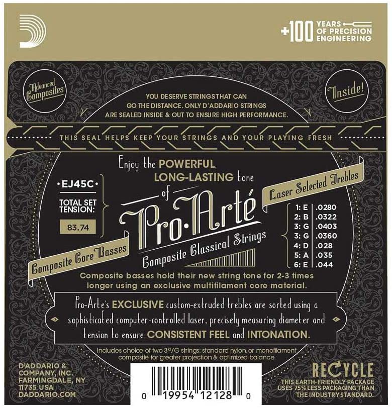 D'Addario EJ45C Pro Arté Normal Tension Gauce Silver Plated Corde per Chitarra Classica con Avvolgimento placcato argento, nucleo composito, acuti in nylon trasparente. EJ45C è il set composito più venduto di D'Addario, preferito per il suo equilibrio tra tono audace ma caldo, sensazione di comfort e proiezione dinamica. Questo set di corde è in rame argentato avvolto su un esclusivo materiale di base composito per un suono potente e duraturo. Include una terza corda composita alternativa per una maggiore proiezione.