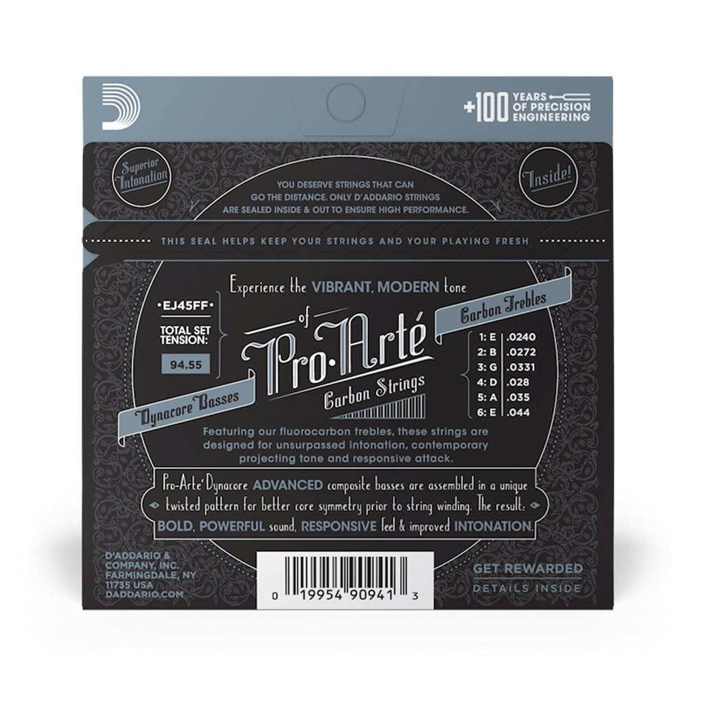 Pro-Arte' Carbon è uno dei set classici più popolari di D'Addario, che fornisce un'intonazione superiore in cima alla perfetta miscela di tono, luminosità e proiezione. L'anima in nylon intrecciato e multifilamento delle corde dei bassi Dynacore crea un attacco brillantemente reattivo con un'intonazione senza precedenti, mentre gli acuti in fluorocarbonio forniscono il tono più brillante e sporgente di qualsiasi acuti classici D'Addario. Il risultato è una moderna proiezione tonale e uno squisito carattere tonale, amato dai musicisti classici. Questo set di tensione normale è la nostra tensione più venduta, preferita per il suo equilibrio tra tono ricco, sensazione confortevole e proiezione dinamica.