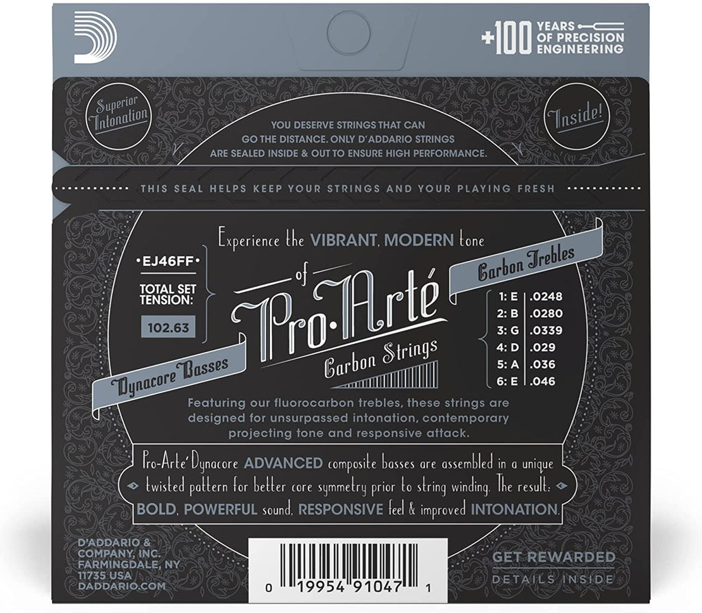 D'Addario EJ46FF Pro Arté Hard Tension Silver Plated Corde Chitarra Classica. EJ46FF, hard tension, presenta alti Pro-Arté Carbon e bassi Dynacore per un'intonazione superiore insuperabile con la perfetta miscela di tono, luminosità e proiezione. Prova il tono vibrante, proiettante e contemporaneo delle corde D'Addario Pro-Arté Carbon. Progettate secondo le rigorose specifiche dei nostri alti in nylon Pro-Arté, le nostre corde in fluorocarbon offrono un'intonazione superiore senza pari, un attacco reattivo e un suono moderno e proiettato. Abbinati ai bassi Dynacore audaci e potenti, i Pro-Arté Carbons offrono la combinazione ideale di tensione e tono per il musicista classico di oggi.