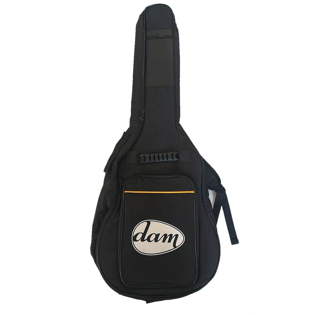 Borsa morbida per chitarra classica, robusta, antistrappo con imbottitura da 12 mm, Nero rifinitura in azzurro con logo bianco DAM sul fronte.