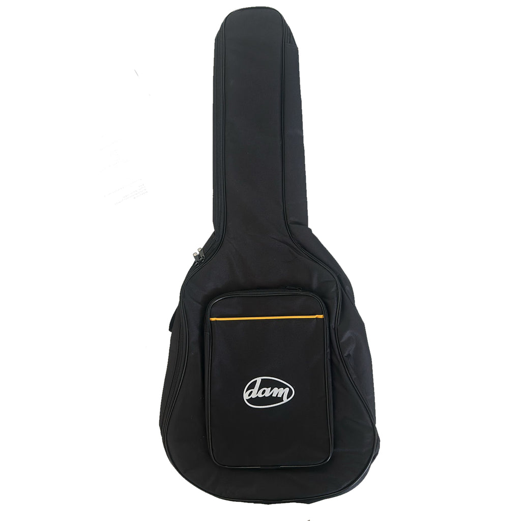 Borsa morbida per chitarra elettrica, robusta, antistrappo con imbottitura da 5 mm, Nero con logo bianco DAM sul fronte e rifinitura in giallo.
