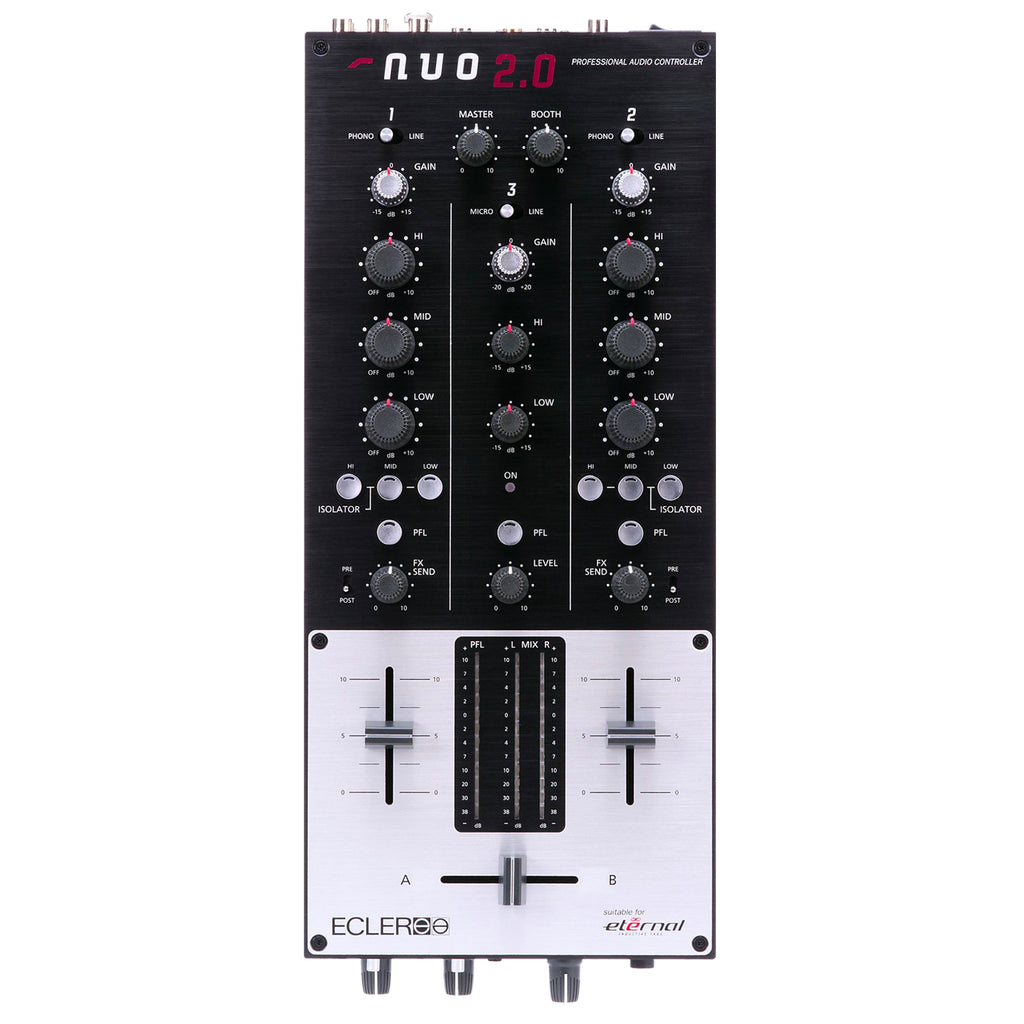 Mixer Professionale per Dj analogico a 2 canali con EQ full-cut, send/return effetti per canale e fader VCA. Crossfader sostituibile con modulo ETERNAL (opzionale).