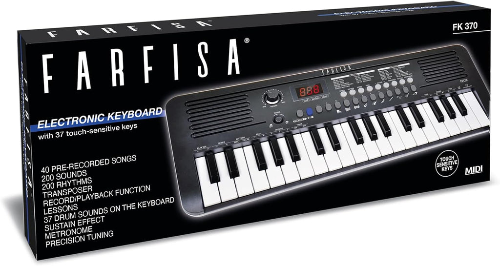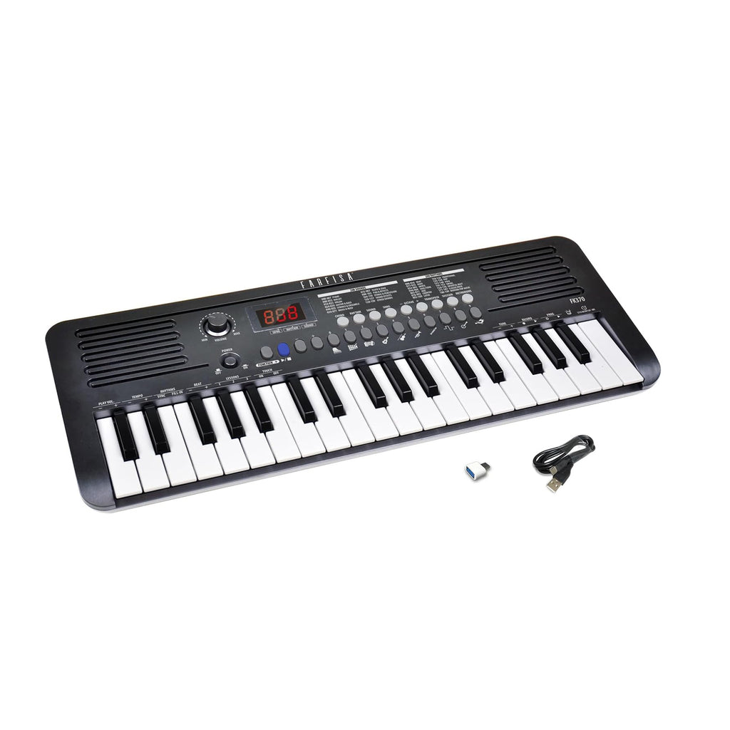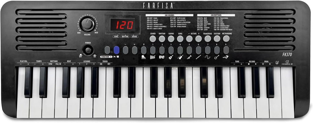 La tastiera elettronica FK 370 è uno strumento versatile e compatto, ideale per principianti e appassionati di musica. Dispone di 37 tasti con funzione touch, che permettono una risposta dinamica al tocco. Offre una vasta gamma di opzioni sonore, con 200 timbri, 200 ritmi e 40 brani dimostrativi preimpostati. Include funzioni come il controllo del volume principale, la trasposizione, l'accordatura fine e il controllo del tempo. È dotata di metronomo, funzione di registrazione e riproduzione, Sustain e modalità di lezione a 3 step (One-Key, Follow, Ensemble). Presenta un'uscita per cuffie, una presa USB di tipo C per l'alimentazione e la connessione ad app. Supporta la trasmissione dati MIDI tramite interfaccia USB Tipo-C. Può essere alimentata con 4 batterie AA o tramite cavo USB-C.