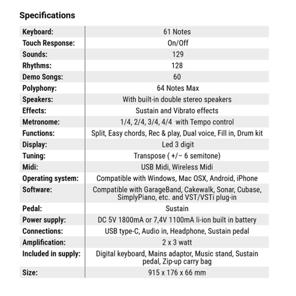 Modello dal design compatto, ideale sia per principianti che per musicisti esperti. 61 tasti sensibili al tocco, che offrono una sensazione simile a quella di un pianoforte. 2 altoparlanti stereo per un suono tridimensionale con bassi potenti e toni caldi. Dispone di modalità come Dual keyboard, Accordi semplificati, Dual voice, Registrazione e riproduzione, Metronomo e Trasposizione. Supporta la connessione MIDI sia con cavo che tramite wireless, rendendola compatibile con software e app musicali come Cakewalk, Sonar, Cubase, Nuendo GarageBand e Simply Piano. Alimentata da una batteria al litio ricaricabile integrata da 7,4V 1100mA. Supporta anche l'alimentazione tramite USB. Supporta cuffie, altoparlanti esterni e connessione al computer tramite USB.