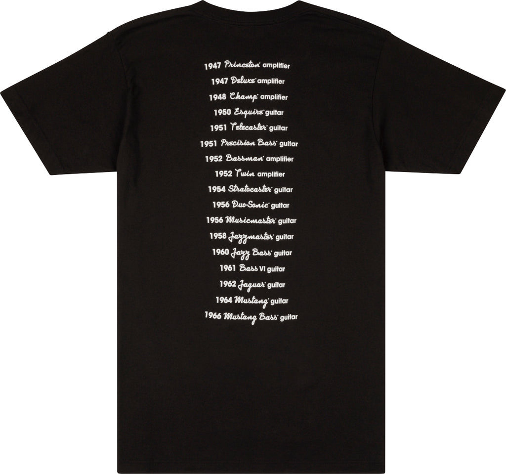 T-Shirt con classico logo Fender Transition sul fronte e un tributo alle chitarre e ampli fondamentali prodotti tra il 1947 e il 1966, sul retro.