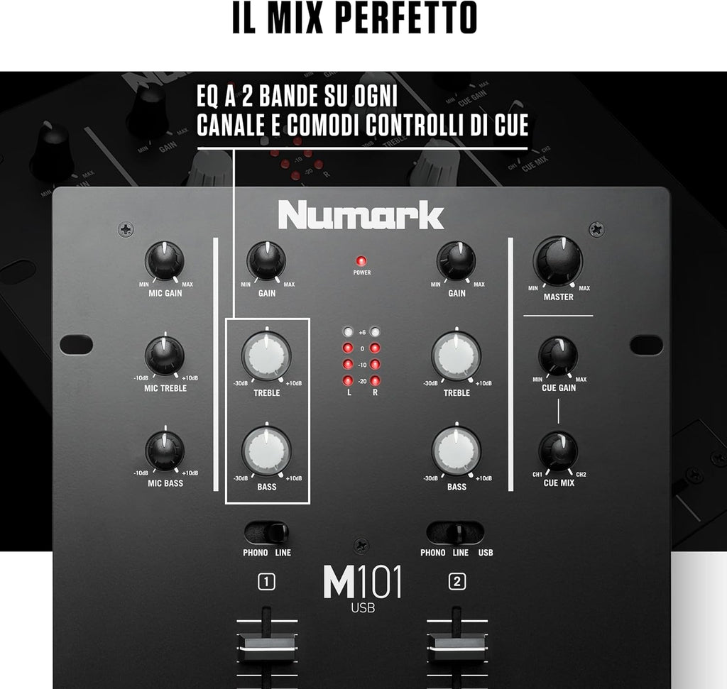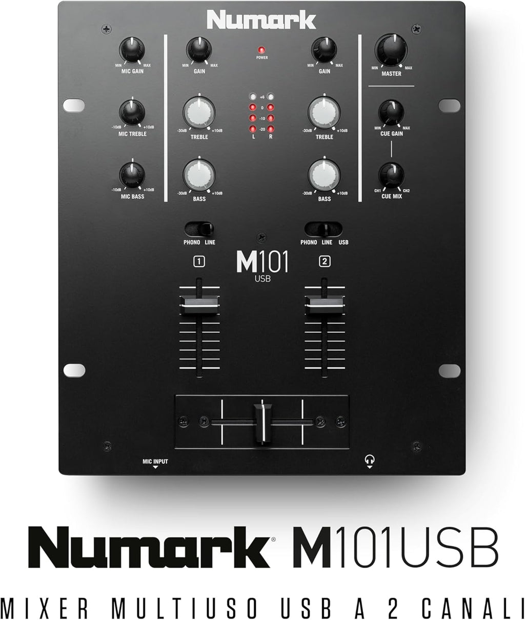 Oltre al semplice mixaggio, l'M101USB è dotato di un equalizzatore integrato che consente di perfezionare il mix in base alle condizioni della stanza o alle tracce stesse. Sono inclusi due coppie di ingressi Phono/Linea commutabili, un crossfader, un ingresso microfonico da ¼" e un'uscita di linea stereo RCA per il collegamento a un amplificatore, diffusori attivi o un altro mixer. L'M101USB può essere montato a rack e vanta la leggendaria robustezza di livello industriale di Numark.