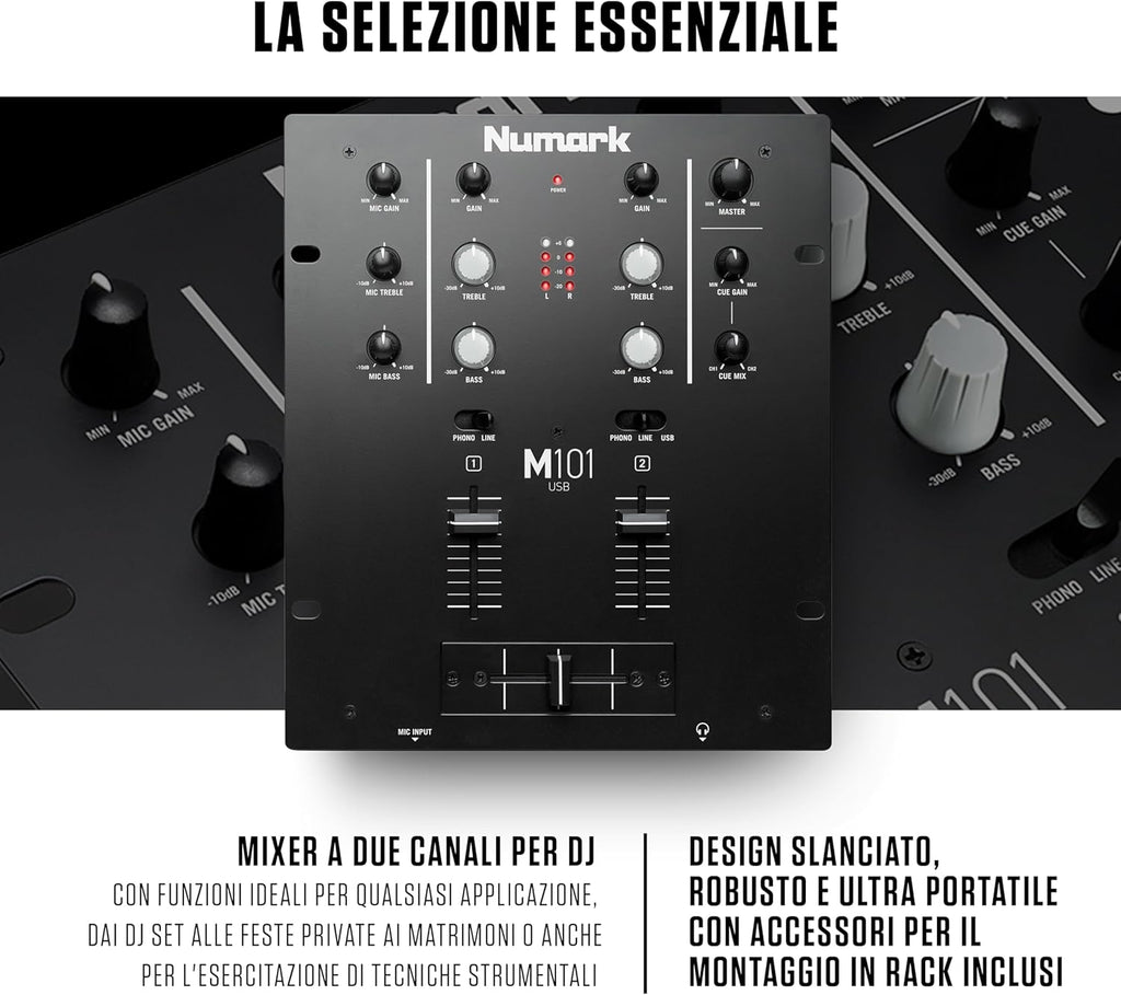 Sia i DJ principianti che quelli esperti che desiderano una soluzione a due canali resistente con porta USB troveranno nell'M101USB la soluzione perfetta. L'M101USB si basa sul mixer a due canali M101 con l'aggiunta di un'interfaccia audio USB facile da usare per i DJ che desiderano la possibilità di lavorare con il proprio computer oltre che con i tradizionali I/O analogici.