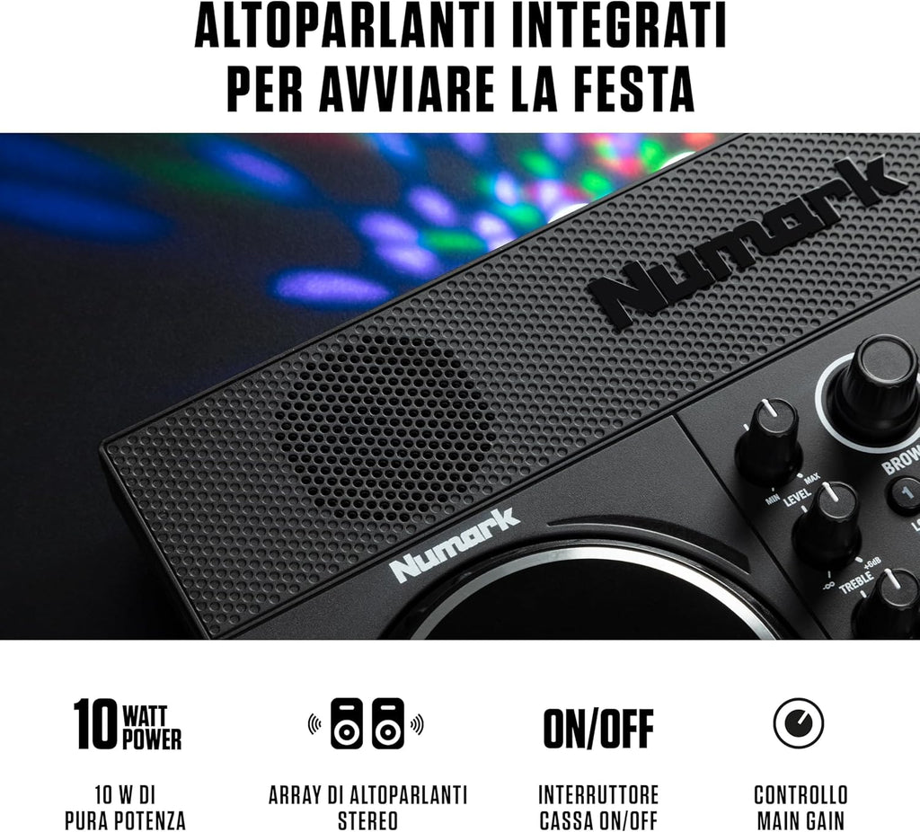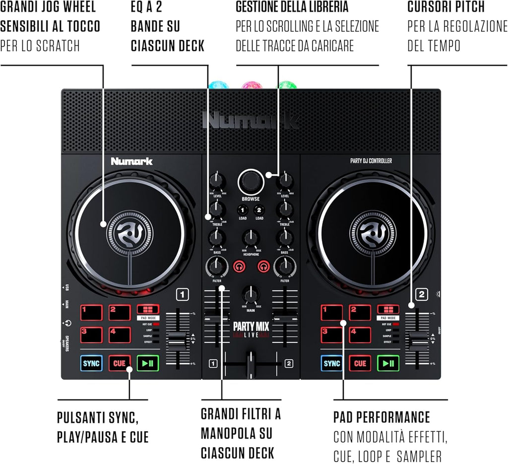 Che tu sia un principiante o un professionista esperto, il controller DJ Party Mix Live ha tutte le funzionalità necessarie per scatenare la festa! Basta collegare il Party Mix Live al tuo laptop o dispositivo mobile e mixare la tua playlist da festa perfetta. Gli altoparlanti integrati ti permettono di riempire la stanza di musica e le luci LED integrate portano l'esperienza a un livello superiore con uno spettacolo di luci colorate e sincronizzate a ritmo! I giorni in cui serviva un'enorme libreria musicale per fare il DJ sono finiti. Con un controller DJ streaming come il Party Mix Live, ogni traccia di successo è letteralmente a portata di mano! Il Party Mix Live include il software Serato DJ Lite, che include l'accesso a piattaforme di streaming come TIDAL, Beatport LINK, Beatsource LINK e SoundCloud GO. Crea le tue playlist su qualsiasi dispositivo e, quando è il momento di festeggiare, accedi ad esse tramite la connessione al Party Mix Live. Non hai un laptop? Nessun problema! Il controller DJ Party Mix Live è compatibile con le più diffuse app per DJ per dispositivi mobili iOS, come djay PRO AI di Algorridim. Basta collegare il tuo dispositivo mobile al Party Mix Live utilizzando un kit di collegamento USB per fotocamere (venduto separatamente) per dare inizio alla festa. Grazie agli altoparlanti integrati, il Party Mix Live è pronto all'azione senza bisogno di collegare altoparlanti esterni. L'interruttore di accensione/spegnimento degli altoparlanti ti permette di riempire la stanza con un suono stereo di qualità o di disattivare facilmente gli altoparlanti integrati per continuare a mixare con le tue cuffie. Il Party Mix Live è il controller DJ con luci definitivo. Con la semplice pressione di un interruttore, lo spettacolo di luci integrato prende vita! Tre LED multicolore e speciali lenti ad ampia copertura diffondono fasci di luce sincronizzati a ritmo in tutta la stanza. Ricco di funzionalità all'avanguardia, il controller DJ Party Mix Live è in grado di passare dalla camera da letto a praticamente qualsiasi concerto. Quattro performance pad su ogni deck consentono un rapido accesso a effetti, punti di cue, loop o campioni. Accanto ai pulsanti Play e Cue su ogni deck si trova il pulsante Sync, che sincronizza automaticamente i tempi delle tracce su ciascun deck per mix perfettamente allineati. Una grande manopola Filter per ogni deck aggiunge un suono di livello professionale ai tuoi mix, e il crossfader regolabile via software consente dissolvenze fluide per i mix o tagli netti per gli scratch. Il Party Mix Live è inoltre dotato di due grandi jog wheel touch di alta qualità che ti permettono di manipolare la tua musica con stile. Metti in pausa, esegui il backspin e persino lo scratch delle tracce mentre procedi nella tua playlist. L'anello esterno della jog wheel funziona come pitch-bend, così puoi allineare le tracce per un mix perfetto. Con il Numark Party Mix Live, sarai sempre pronto per una festa, sempre e ovunque!