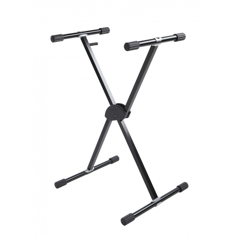 Supporto per tastiera a telaio singolo rinforzato, di robusta costruzione. Dotato di tubi di acciaio di alta qualità e giunzioni in alluminio che garantiscono la massima affidabilità. Dotato di un nuovo meccanismo di rilascio di facile utilizzo grazie all'ausilio di una leva che consente una configurazione rapida e una selezione di quattro diverse posizioni d'altezza. E' provvisto inoltre di tappi di gomma autolivellanti che permettono la regolazione su superfici irregolari e assicurano una maggiore stabilità. Fornito smontato per un più facile trasporto. Colori disponibili: nero opaco con inserti in grigio.