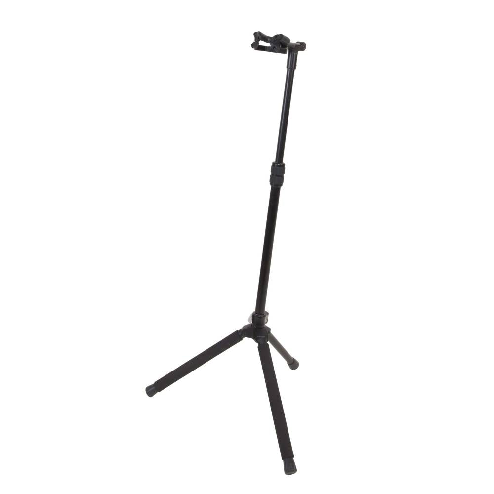 Supporto universale da terra per chitarra, realizzato in acciaio e alluminio. Regolabile in altezza per mezzo del manicotto in alluminio pressofuso ricoperto in gomma "soft-grip". Dotato del sistema di chiusura AUTO-LOCK, che permette il blocco automatico della chitarra semplicemente appoggiandola sul gancio predisposto. Tutte le parti a contatto con il prodotto sono rivestite in morbida gomma ed EVA per proteggere la finitura dello strumento. Completamente ripiegabile per un facile trasporto. Colore nero opaco.