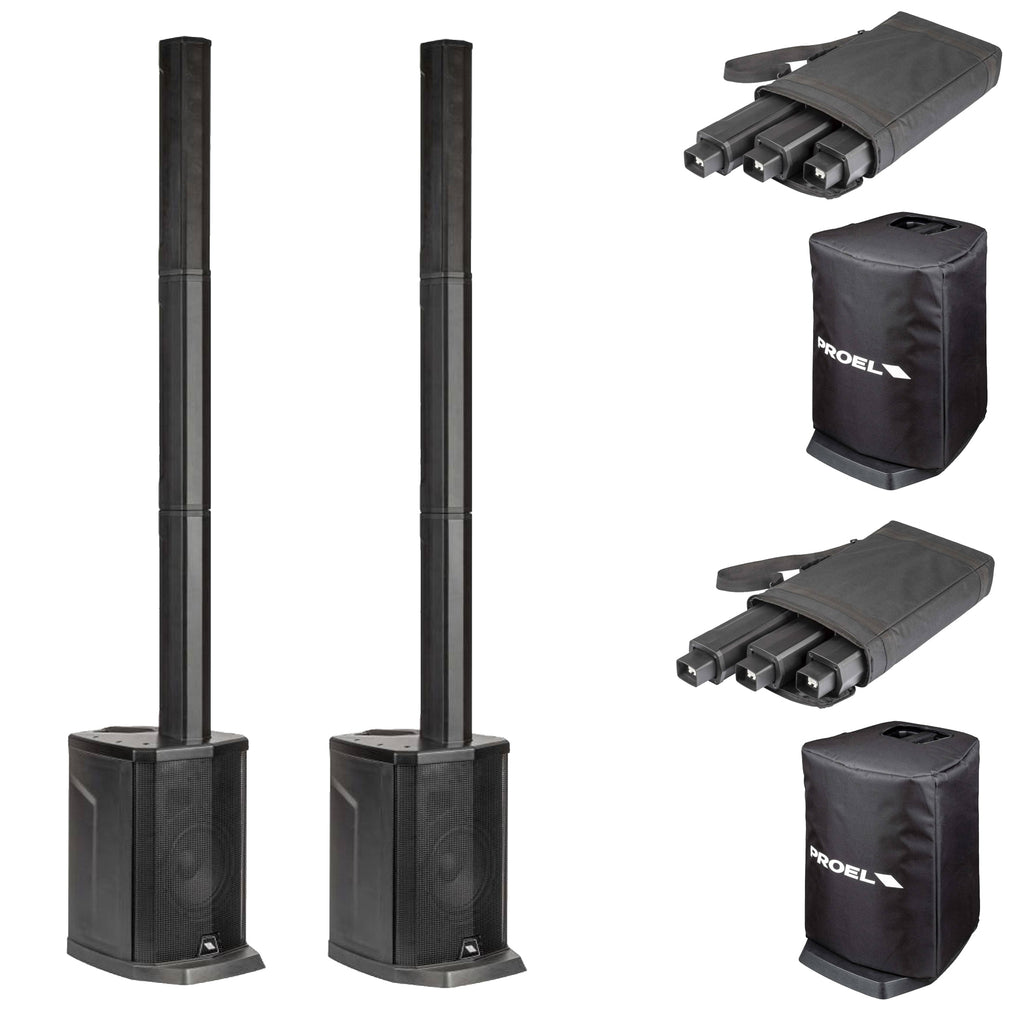 Coppia Proel SESSION1 Sistema audio a colonna a 2 canali 400W di picco con MP3 / USB /SD player e BLUETOOTH STEREO + 2 MIC/LINE + 1 STEREO IN - 1 LINE Out - HI + LOW EQ + borsa satelliti inclusa, Nero. SESSION1 è un sistema a colonna portatile dotato di ingressi multipli e di un versatile lettore MP3 con connettività BLUETOOTH. Alloggiato in cabinet in polipropilene leggeri e allo stesso tempo robusti, è formato da una colonna con 4 altoparlanti full-range da 2.5" ed un potente subwoofer da 8". L'elettronica allo stato dell'arte include una sofisticata sezione di pre-amplificazione con filtri attivi e doppi LIMITER, ed un potente amplificatore in Classe D da 400W. Il MEDIA PLAYER che trovate a bordo è in grado di riprodurre musica non solo da una card SD o da una chiavetta di memoria USB, ma anche dal vostro smartphone o tablet attraverso una connessione BLUETOOTH, senza bisogno di cavi. Il mixer a tre canali incorporato permette di collegare 2 microfoni o sorgenti linea ed un player stereo. Un effetto digitale è disponibile per gli ingressi microfonici. Con una semplice manopola è possibile ottimizzare il suono per voce, musica o bassi spinti adattando il sistema ad ogni situazione. SESSION1 può essere utilizzato in una varietà di applicazioni, dalla diffusione vocale e di musica dal vivo, alla riproduzione di musica e ai DJ sets.