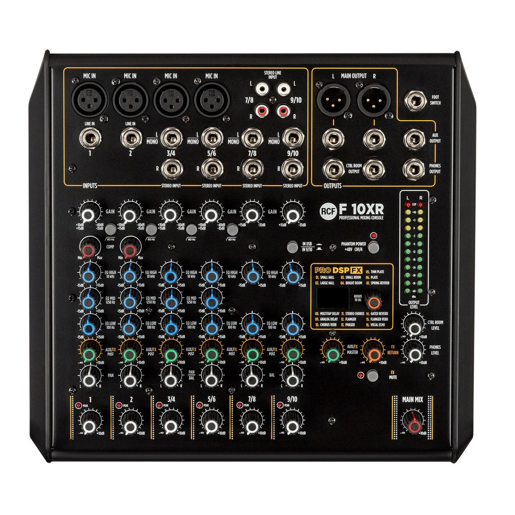 RCF F 10XR Mixer Professionale a 10 Canali con Sezione PRO DSP FX, USB e Registrazione e riproduzione stereo via porta USB audio. Inspirata alle unita' analogiche professionali della Serie E, la nuova generazione di mixer RCF della Serie F offre un'elevata qualita' sonora e la possibilita' di scelta tra quattro formati compresi tra 6 e 16 canali. Un potente strumento per il musicista e l'appassionato, concepito e progettato interamente dal team R&D di RCF. Costruito in un robusto telaio in metallo, ciascun mixer mette a disposizione un flusso audio interamente bilanciato da ingresso a uscita, oltre ad un esclusivo processore PRO DSP FX: 16 effetti professionali, tra cui Riverberi (Hall, Room, Plate, Spring), Delay (Mono, Stereo e Multitap), Chorus, Flanger e Echo. I modelli F 10XR, F 12XR e F 16XR includono un'interfaccia audio USB, per la registrazione stereo su sistemi DAW su PC, e 2 canali per la riproduzione.