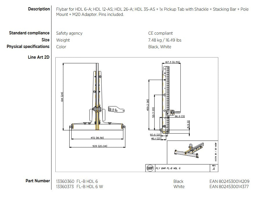Flybar per HDL 6-A; HDL 12-AS; HDL 26-A; HDL 35-AS + 1 linguetta di presa con grillo + barra di impilamento + supporto per asta + adattatore M20. Perni inclusi.