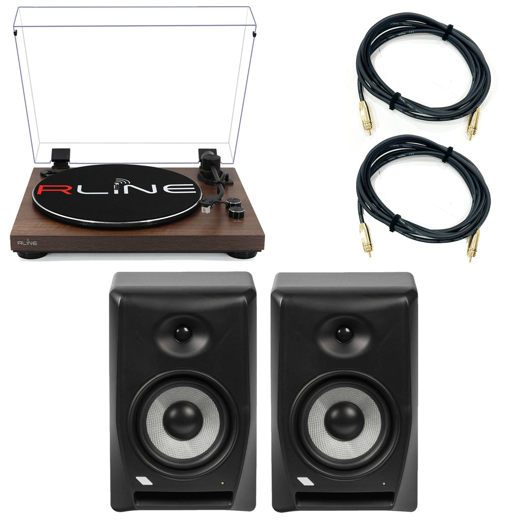 Giradischi con trazione a cinghia e modulo Bluetooth per cuffie o speaker BT wireless, Noce + Coppia Monitor audio professionale da Studio, bi-amplificato near-field 25+45 W, con amplificatori in Classe AB, Nero + Coppia Cavo audio professionale con connessioni 1 x spina maschio RCA a 1 x spina maschio RCA, Guaina Nera. Lunghezza: 3 metri.