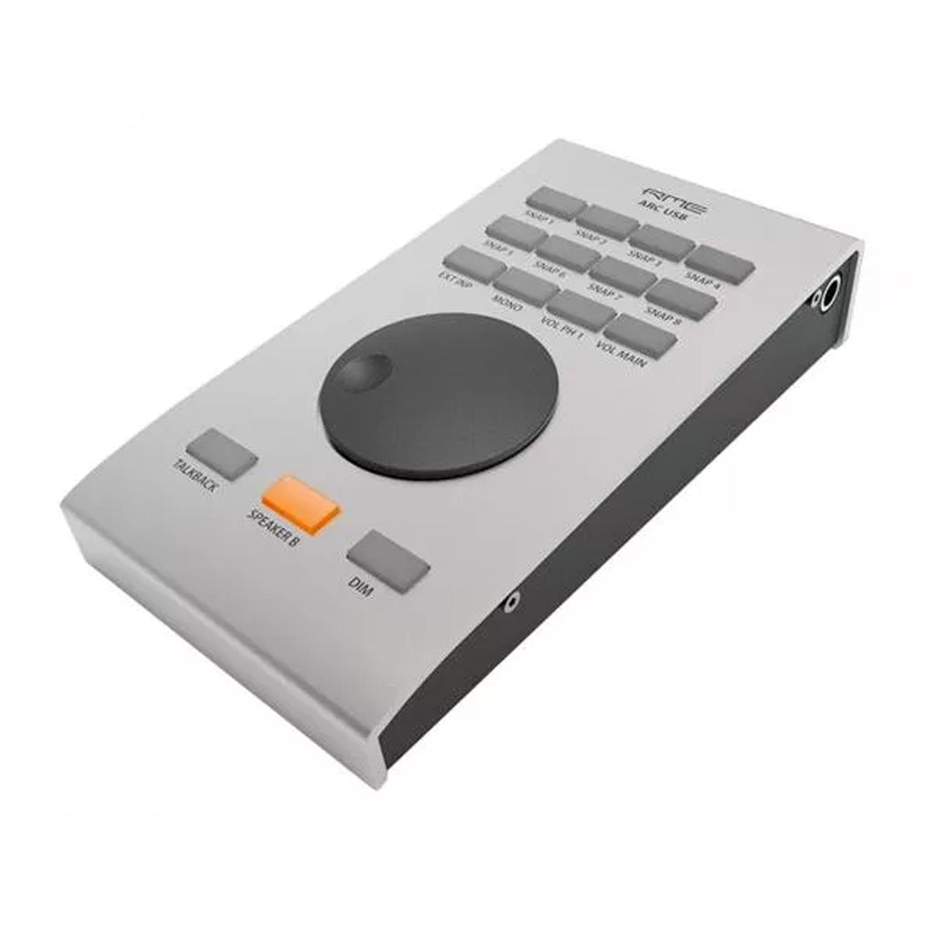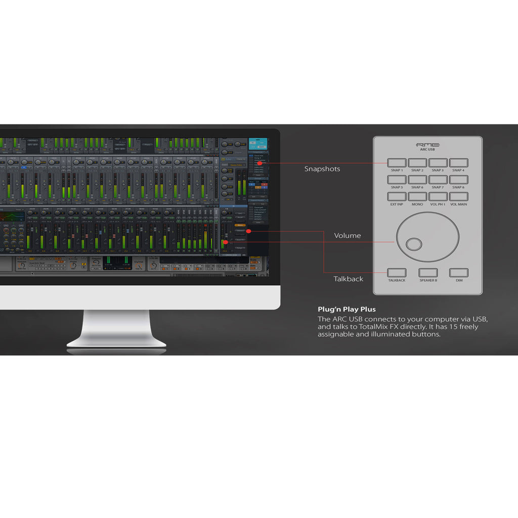 L'ARC USB si collega al computer tramite USB, e dialoga direttamente con il TotalMix FX. Dispone di 15 pulsanti liberamente assegnabili e illuminati, un encoder e un jack TS per collegare un interruttore a pedale. L'ARC USB è un controllo remoto USB 1.1 MIDI per la Fireface UFX+/UFX II. Grazie al funzionamento come dispositivo in classe UAC 1, è compatibile in modalità nativa con Windows e Mac OSX. Non appena è presente nel sistema operativo, TotaIMix FX rileverà automaticamente l'ARC USB, e comunicherà con esso tramite semplici comandi remoti MIDI per controllare l'UFX+.