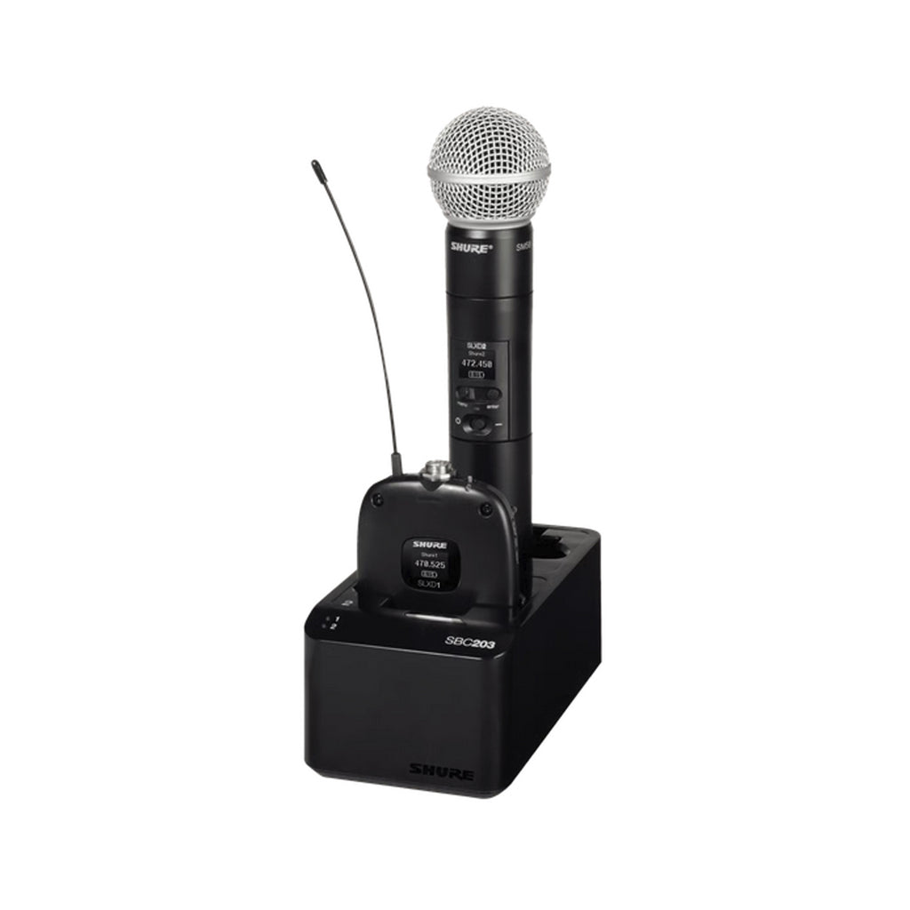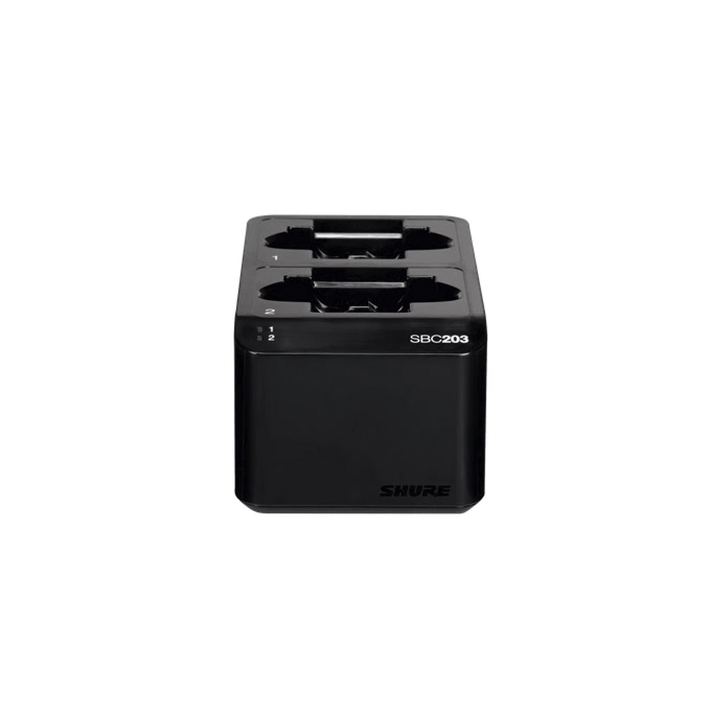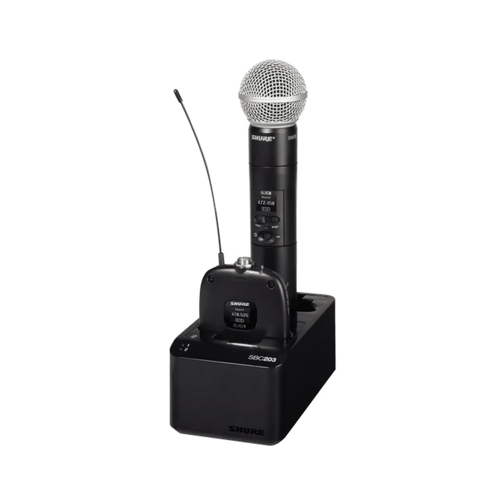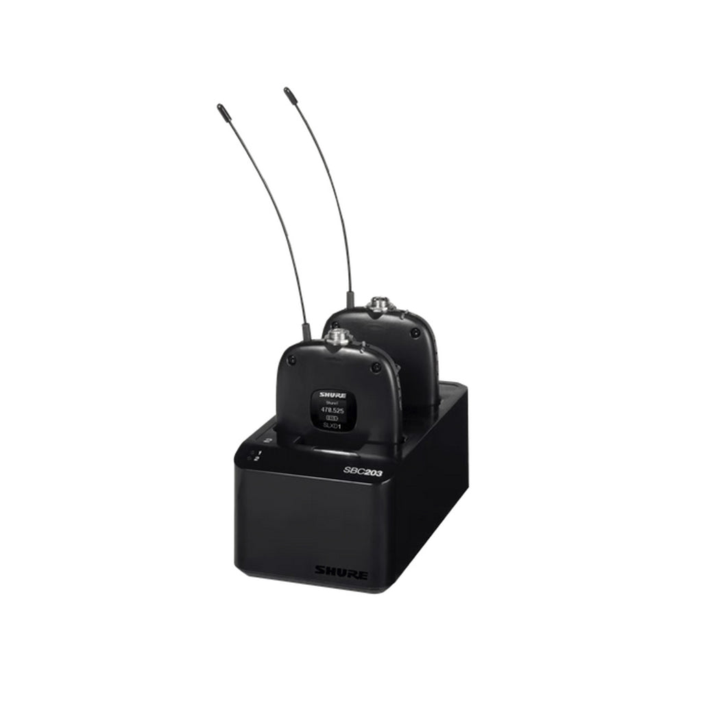 La stazione di ricarica a doppio docking carica due batterie agli ioni di litio SB903 all'interno o fuori dai loro trasmettitori. Costruito per ricaricare due batterie, due trasmettitori body pack, due trasmettitori a mano o qualsiasi accoppiamento di due trasmettitori SLX-D o batterie SB903.