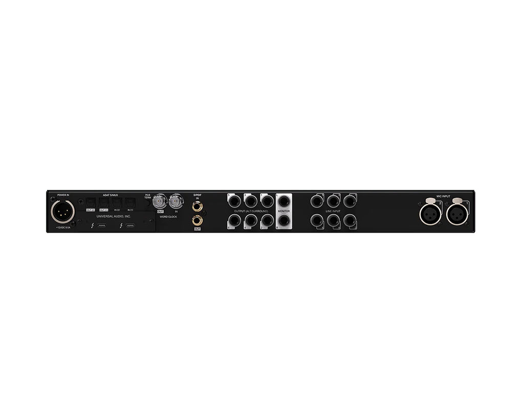 2 preamplificatori microfonici Unison, 2 ingressi per strumenti Hi-Z, 8 ingressi di linea da 1/4", 2 I/O ottici Toslink (ADAT S/MUX), I/O coassiali RCA (S/PDIF), I/O word clock (BNC)