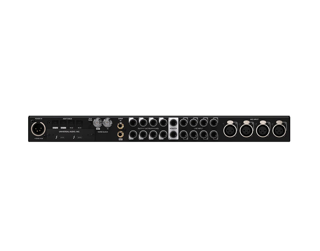 Quattro preamplificatori microfonici Unison™, due ingressi Hi-Z per strumenti, otto ingressi linea 1/4", due I/O ottici Toslink (ADAT S/MUX), I/O coassiali RCA (S/PDIF), I/O word clock (BNC)