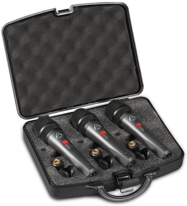 Set composto da 3 Microfoni dinamico super cardioide cablato con interruttore On/Off, per voce + supportino per asta microfonica.