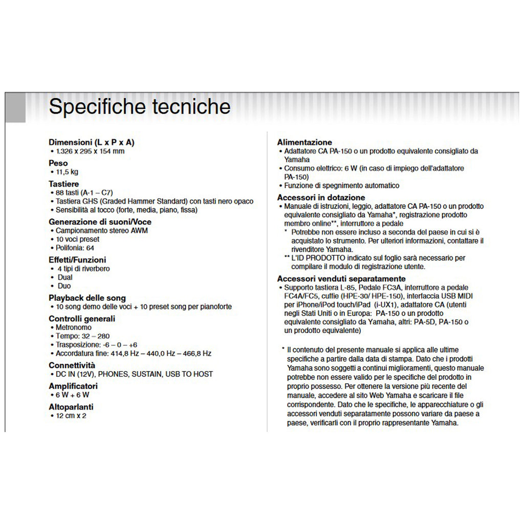 Goditi il tocco di un autentico pianoforte ovunque ti trovi. Questo pianoforte digitale compatto ed elegangte è semplice da usare. Il modello P-45 è dotato di una tastiera graded hammer standard (GHS). Il tocco della tastiera si modifica gradualmente a seconda del registro, in modo che il tocco sia più pesante nei registri gravi e più leggero nei registri acuti. Lo strumento dispone inoltre di una tastiera dal tocco naturale, con tasti neri dotati di finitura opaca per garantire un tocco analogo a quello di un pianoforte acustico. P-45 è stato rinnovato utilizzando la sintesi AWM al fine di produrre suoni piano autentici. AWM è una tecnologia che utilizza le registrazioni digitali delle sorgenti e permette di apprezzare in qualsiasi luogo il riverbero caratteristico di un pianoforte a coda. Affusolato e ricco di stile, con una profondità inferiore a 30 cm, lo strumento necessita di poco spazio, e con solo 11.5 kg di peso – con l'altoparlante collegato – esso può essere spostato facilmente o utilizzato per le performance fuori casa. Diverse impostazioni del P-45 possono essere modificate attraverso un singolo tasto. Tenendo premuto il tasto ""GRAND PIANO/FUNCTION"" e toccando la tastiera è possibile modificare il timbro, riprodurre sorgenti demo, configurare il metronomo e molto altro. Ci sono 10 voci stereo campionate con 64 note polifonia (max) e preset di effetti riverbero/chorus. In modalità Dual, due voci possono essere combinate per ulteriore versatilità. La funzione Duo divide la tastiera in due zone con uguale estensione, permettendo allo studente di seguire e imitare facilmente le mani dell'insegnante, perfetto per una sessione di insegnamento. Sono presenti le facili funzioni di tuning e transpose, perfette per accompagnare cantanti e altri strumenti e una porta USB-host per la connessione al computer e dispositivi iOS. E' disponibile uno stand opzionale che conferisce allo strumento un aspetto elegante in qualunque ambiente sia posizionato.