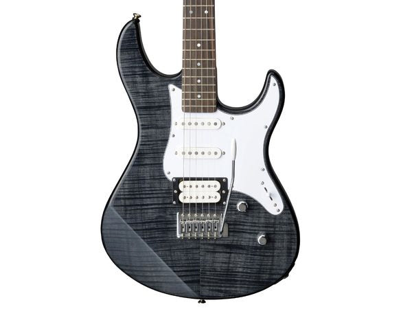 Yamaha PAC212VFM TBL Chitarra Elettrica serie Pacifica a 22 Tasti, Translucent Black. Si presenta con accattivanti figure in acero sulla parte superiore del body e sulla paletta, la Pacifica212VFM è una variante della Pacifica 112V sviluppato appositamente, e che è stato molto apprezzato con la Pacifica112J. Questo modello offre le stesse caratteristiche della Pacifica112V, come i pickup in Alnico e la funzione coil tap, mentre il suo bellissimo top acero fiammato offre una presenza senza precedenti con il suo look di alta classe. Questo modello ha anche figure in acero sulla sua paletta con una finitura corrispondente. Sono disponibili tre colori trasparenti per mettere in evidenza i disegni dell'acero con un look di alta classe.