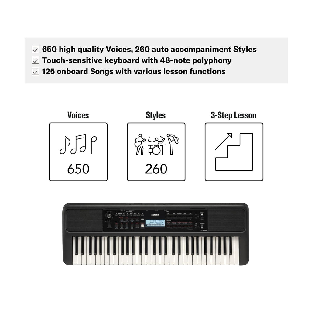La tastiera entry level di Yamaha risponde ai tuoi pensieri e alle tue emozioni, aiutandoti ad esibirti in modo espressivo. Grazie alla funzione touch response, che offre un controllo dinamico del suono, ad un'ampia gamma di 650 Voices tra cui il grand piano, così come ad altre complete funzioni didattiche, la pratica e l'esibizione saranno il più naturale e divertente possibile. Premi i tasti con decisione per avere suoni più forti, o delicatamente per ottenere suoni più dolci: una risposta al tocco così espressiva è in grado di far emergere anche le più piccole sfumature sonore. Inoltre, una vasta gamma di voci strumentali, tra cui pianoforti, chitarre, bassi, batterie e molti altri, oltre a una serie di brani incorporati, ampliano ulteriormente il piacere di suonare. Le tastiere sono dotate della funzione 3-step Lesson che consente di esercitarsi in base al proprio livello personale, con solo con la mano destra, con solo quella sinistra o con entrambe le mani grazie alle Song integrate, e di provare ripetutamente le stesse frasi a seconda delle necessità. Inoltre, valuta le tue sessioni di pratica fornendoti un feedback per trarne la massima soddisfazione e divertimento. Suonando la nota fondamentale di un accordo, le potenti funzioni di Style aggiungono automaticamente la base corretta (parti ritmiche, basso e armonia) per adattarsi perfettamente ai tuoi accordi, così che sembrerà di esibirti con un'intera band di supporto. Inoltre, la funzione di Auto Chord produce automaticamente gli accordi appropriati, consentendo di sperimentare progressioni musicali e contribuendo ad ampliare il range delle prestazioni.