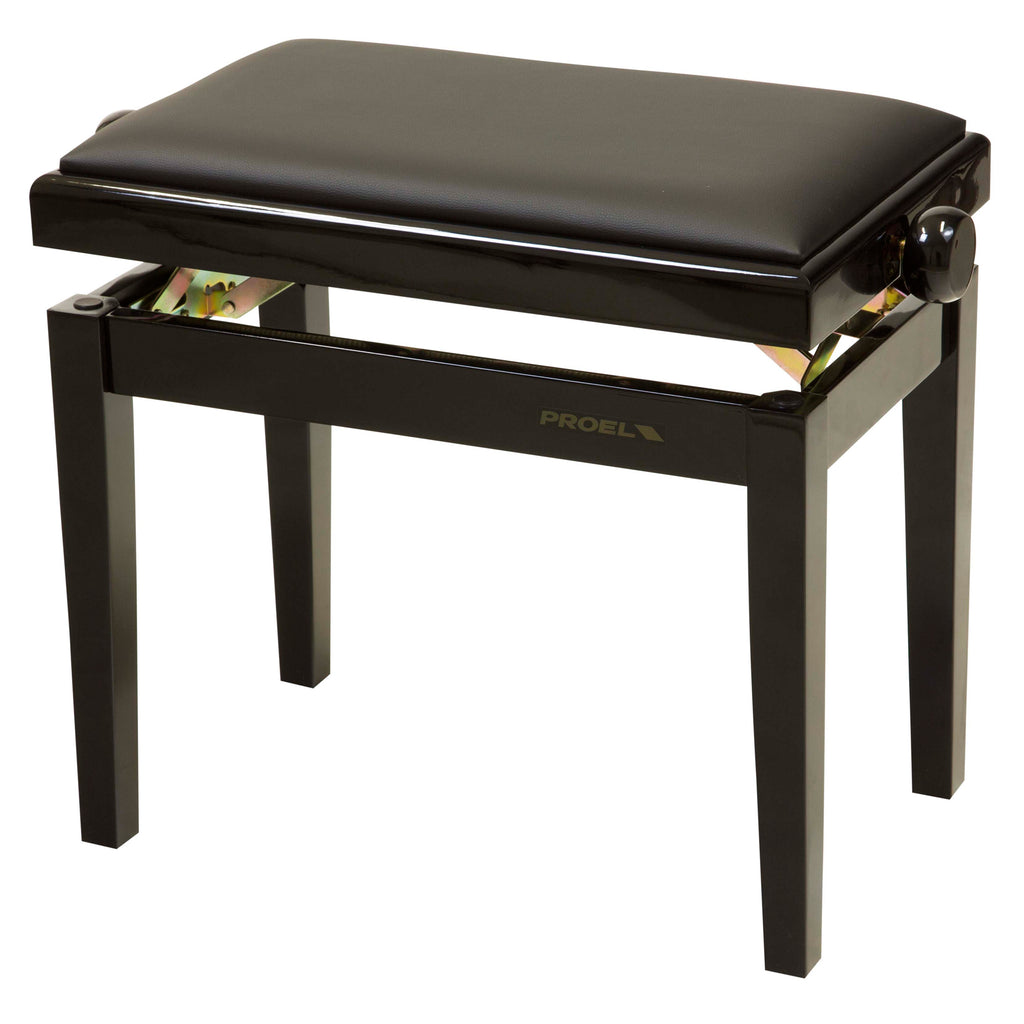 Proel PB90SBBBK Panca professionale regolabile in legno per piano ed organo, seduta imbottita con rivestimento in similpelle, meccanica in acciaio con finitura tropicalizzata, comode manopole per la regolazione dell'altezza. Telaio Nero Lucido. Cuscino con rivestimento in similpelle nera.