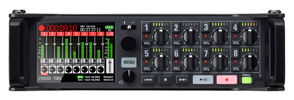 Se lavori nella produzione indipendente di film o nella registrazione su dispositivi mobili, lo Zoom F8N è il registratore da campo multitraccia che stavi aspettando. Questo registratore di campo a 10 tracce con 8 ingressi e 4 uscite offre preamplificatori a basso rumore, compatibilità con time-code, ampia misurazione integrata e doppia scheda SDXC ridondante a 24-bit / 192kHz. Il limiter look-ahead avanzato dell'F8N assicura che non perderai mai una grande ripresa a causa dell'audio distorto. Diverse fonti di alimentazione includono batterie interne ed esterne più CA, e l'F8N va anche oltre la maggior parte dei registratori di campo high-end con il controllo remoto Bluetooth tramite un'app gratuita per iOS. Volume, nitidezza e immersione sono ugualmente importanti per un corretto monitoraggio sul campo. Ecco perché sono stati apportati aggiornamenti all'elaborazione delle cuffie dell'F8n per massimizzarli tutti. E' stato aggiunto un incremento del gain digitale per ridurre al minimo il bleed ambientale, che può causare un combo filtering con conseguente scarsa qualità audio. I segnali possono essere liberamente indirizzati ai canali sinistro e/o destro delle cuffie, pre o post-fader. Inoltre, l'uscita della cuffia può essere commutata su mono. E' inoltre possibile impostare i suoni di avviso delle cuffie per batteria scarica, avvio/arresto registrazione o errori di registrazione.